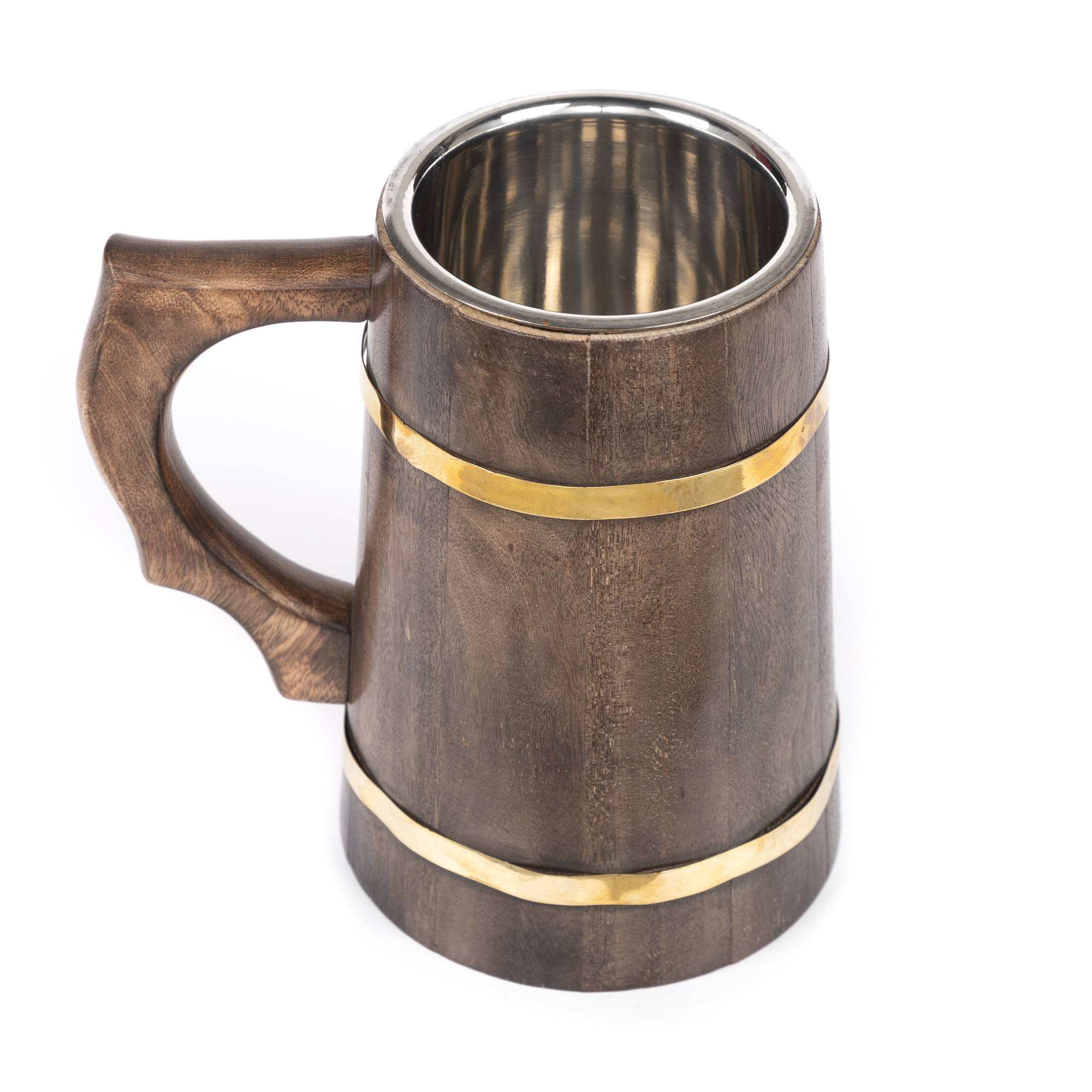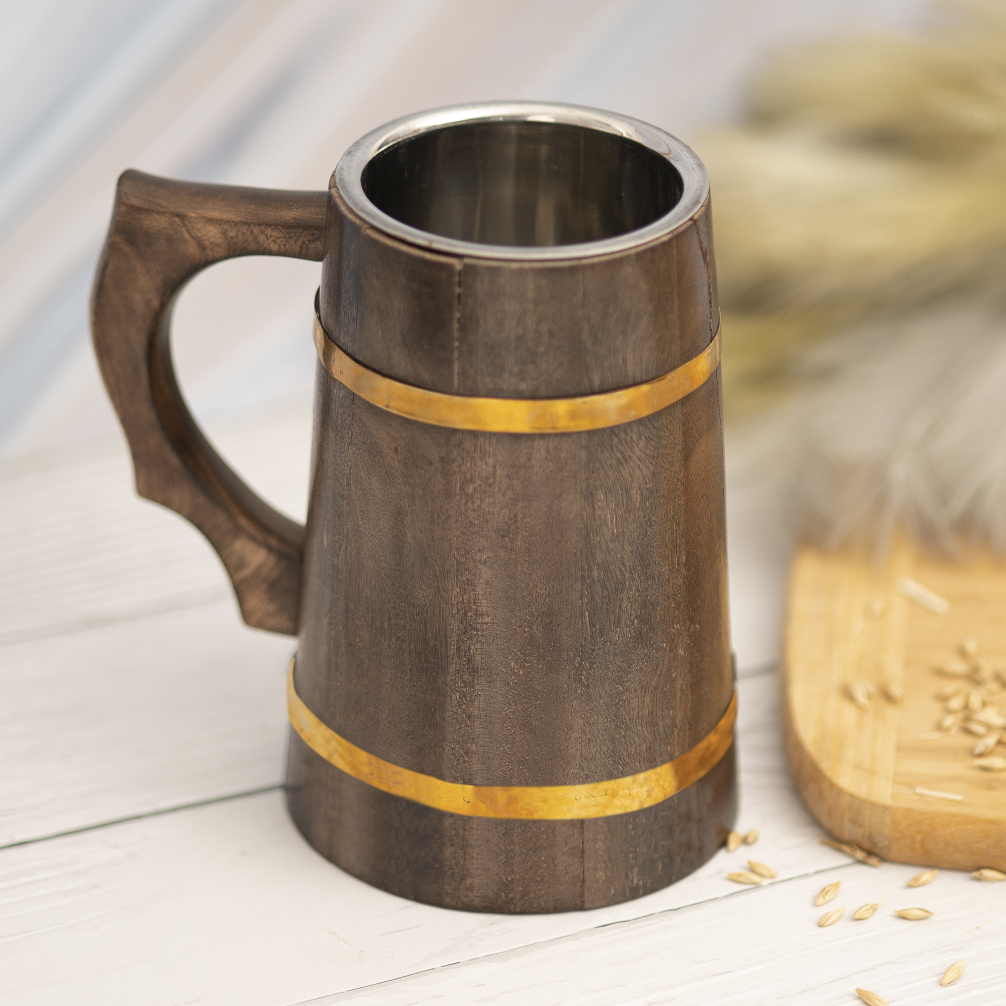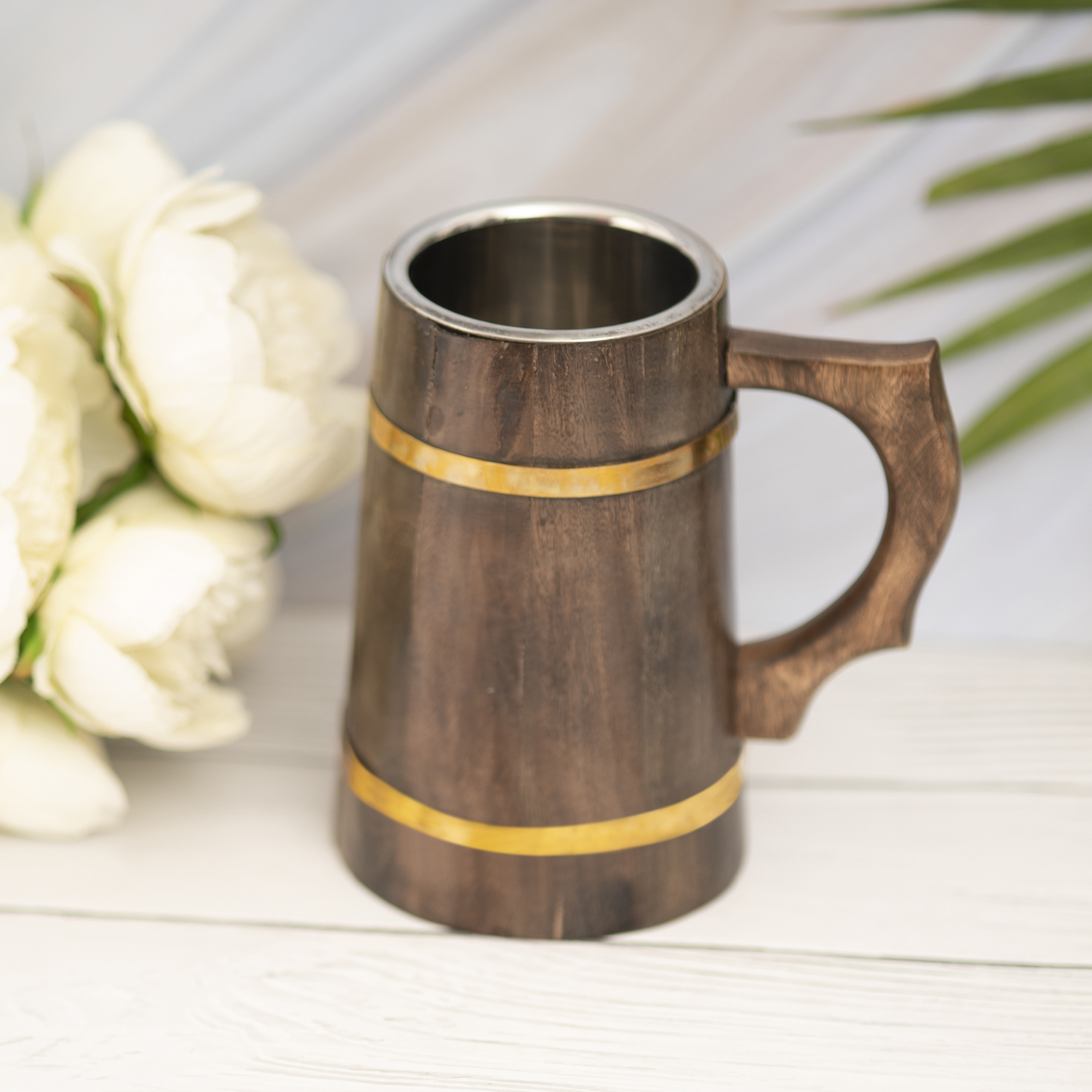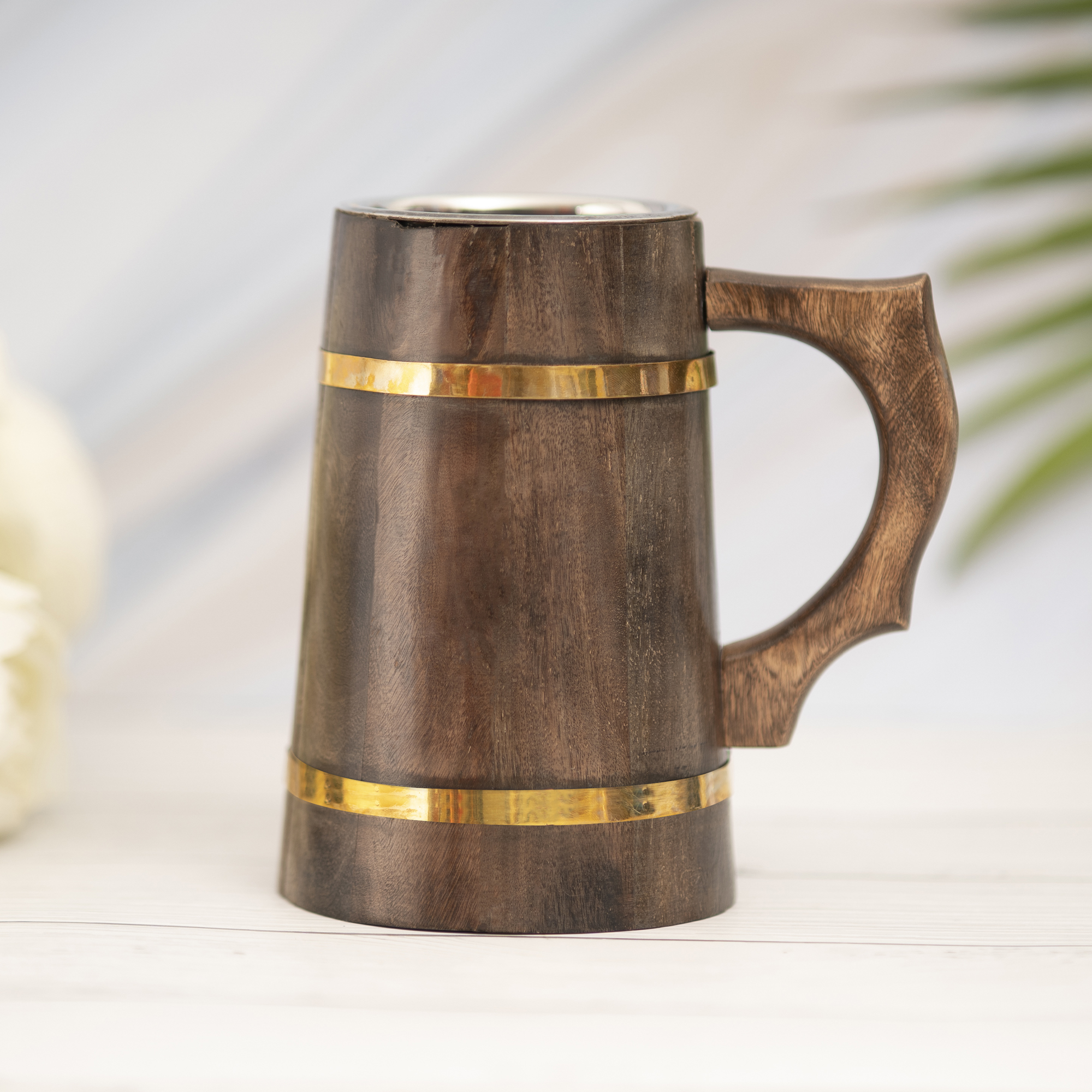 Large Sized Wooden Mug with Dual Golden Stripes